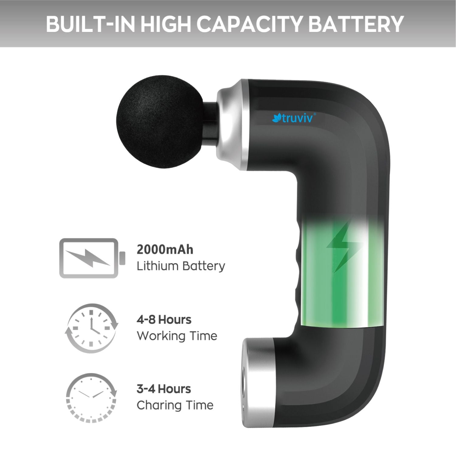 Battery Life - Truviv Ultra is powered by genuine 2000 mAh Premium Lithium Ion battery which delivers 4-8 hours of usage. Much like mobile phones, battery life is important for wireless handheld massage guns as no one likes to have to charge their devices after every use. It is especially important for heavy users such as therapists to have a longer device battery life to be able to treat their clients throughout the day.