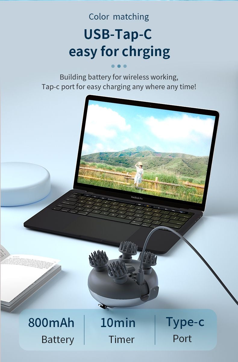 - Compact & Rechargeable this hair scalp massager is lightweight and portable, fitting easily into pocket or bag. You can charge it conveniently with the attached USB charging cable and enjoy soothing massage anytime and anywhere. Cordless operation and one-button control make it hassle-free for home, office, and on-the-go use.