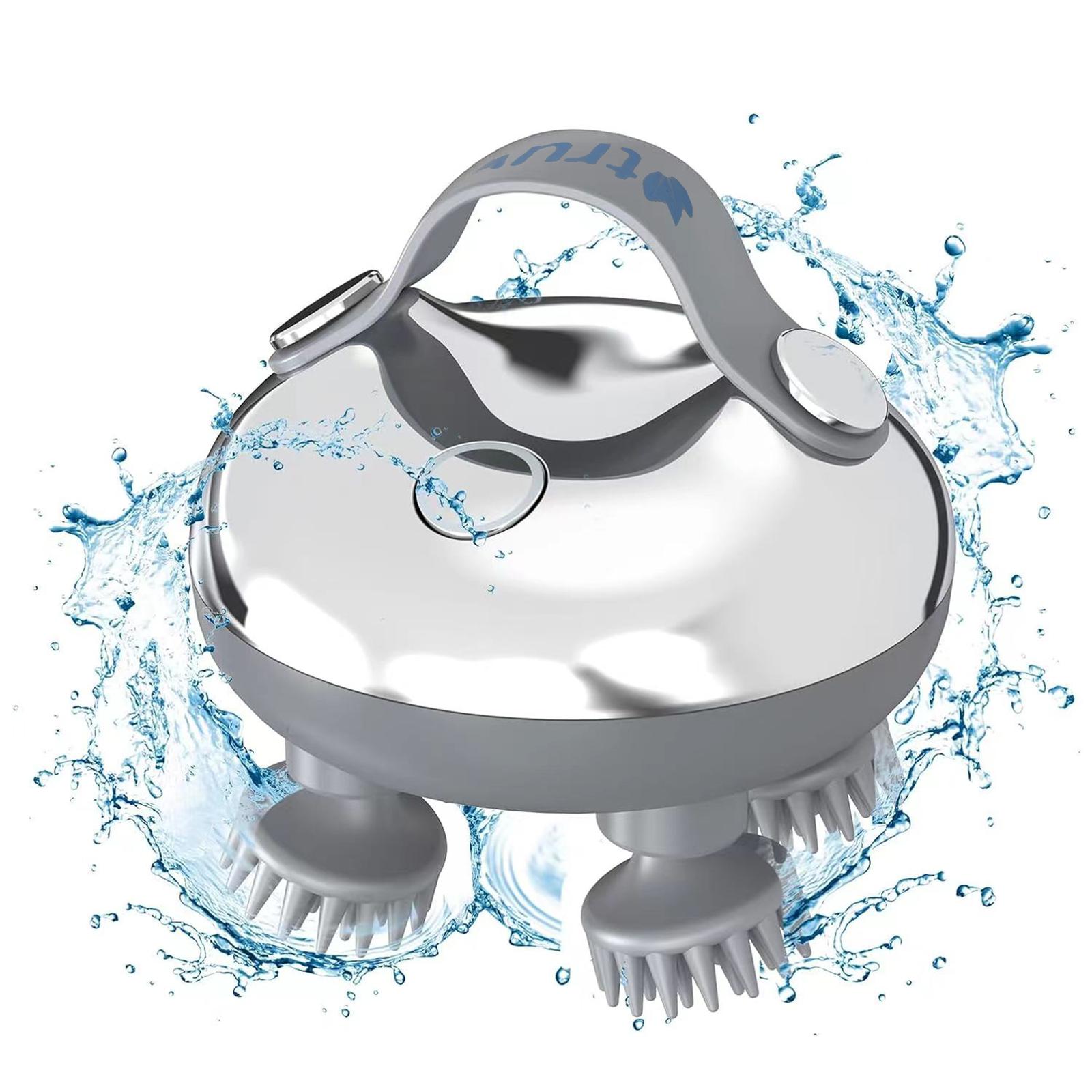 - Waterproof & Versatile - Usage With its waterproof rating IPX7, the scalp massager electric can be used as a shampoo brush in the shower or bathtub, delivering spa-like relaxation at home. 4 piece silicon brush heads for 3D deep face clean massage. Its ergonomic silicone handle reduces hand grip pressure and guarantees a comfortable and non-slip grip. Suitable for both wet and dry hair, it's also effective for massaging the neck, arms, back, leg, and other body parts. It is ideal for massaging various body parts and even pets.